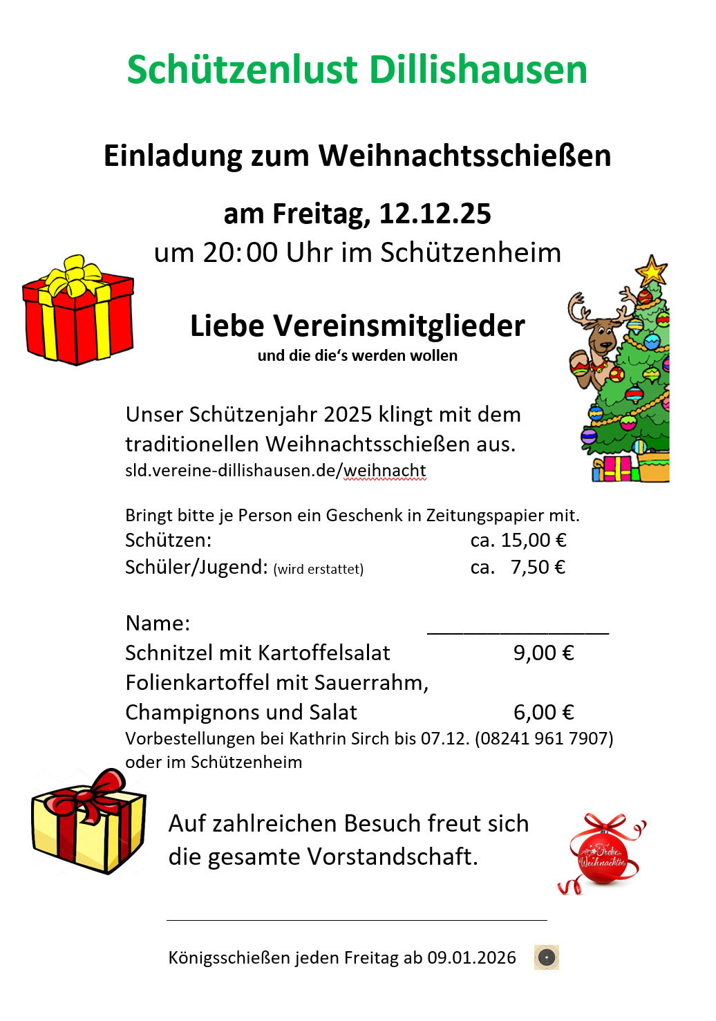 Jeder der sich daran beteiligen möchte bringt ein Geschenk in Zeitungspapier verpackt mit. Während des Abends kann dann mit dem Luftgewehr auf eine Weihnachtskugel geschossen werden. In der Kugel befindet sich eine Nr, die dann über die Reihenfolge entscheidet, sich ein Geschenk aus dem Berg der verpackten Geschenke auszusuchen. Klassisches Wichteln, nur der Empfänger wird erst am Abend ermittelt.